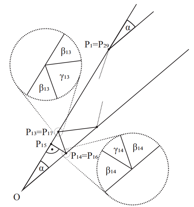 $\beta_n=90^\circ-(15-n)\alpha$ and $\gamma_n=2(15-n)\alpha$ for any $n=14,13\ldots, 1$ – we have seen that it holds for $n=14,13$. Notice that the angles of the $P_{n}P_{n-1}P_{n-2}$ triangle are $\beta_{n}, \gamma_{n-1}, \beta_{n-2}$, so $\beta_{n-2}=180^\circ-\beta_n-\gamma_{n-1}$. Applying the inductive hypothesis for $\beta_n$ and $\gamma_{n-1}$, we have