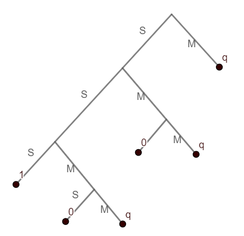 Let us introduce notation: in the sequence of Casey's shots, successful ones will be denoted by $S$, missed ones by $M$. If the bet is fair, then Alex and Blair both win with the same probability $1/2$. In order to determine the correct value of $p$, let us determine the probability that Alex wins as a function of $p$. Given a $p$, let $q$ denote the probability that Alex wins. Notice if the first shot is a miss, then no sequence of the form SSS or SMS can involve the first shot, so in this case, after the first shot, the probability of Alex winning is still the same $q$. However, if the first shot is S, various things can happen: