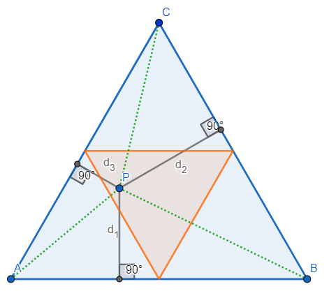 $$T_{ABP}=d_1\cdot\frac{a}{2},\ T_{BCP}=d_2\cdot\frac{a}{2},\ T_{CAP}=d_3\cdot \frac{a}{2},$$