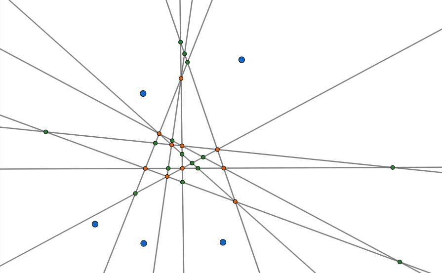 We can construct such an arrangement inductively as follows. We begin by picking $3$ non-collinear points, and pick new points, one at a time, according to the following rules:
