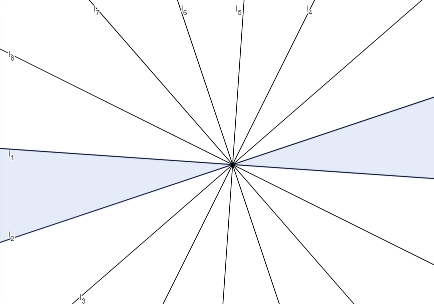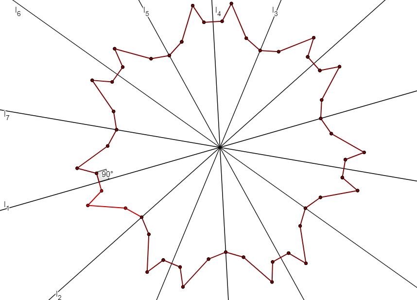 The idea above also gives a method to construct a $n$-gon with exactly $k$ symmetries for any divisor $k$ of $n$, showing one exists for any such $k$. Choose a point $O$ on the plane, and draw $k$ lines $l_1, l_2, \ldots, l_k$ through $O$ in such a way that the angle of $l_i$ and $l_{i+1}$ is $\alpha=180/k$ degrees. It will be convenient to use the notation we had before, and define the infinite sequence $l_1, l_2, \ldots$ where $l_i=l_{i+k}$ for any $i$. These $k$ lines divide the plane into $2k$ connected segments. Choose one of the segments bounded between the line $l_1$ and $l_2$ -- we will construct the part of $P$ that falls into this segment, and construct $P$ by iteratively reflecting this to fill all the segments.