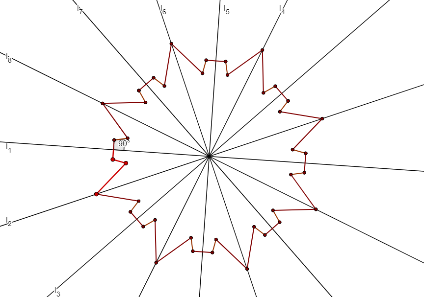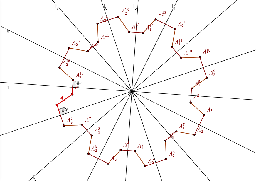 For each $i$, reflect $A_i$ about $l_2$ to obtain $A_i^2$, then reflect $A_i^2$ about $l_3$ to obtain $A_i^3$, and so on, keep reflecting to construct $A_i=A_i^1, A_i^2, \ldots, A_i^{2k}$. Notice that $A_i^j=A_i^{2k+j}$, furthermore $A_i^{j}$ and $A_i^{k+j}$ fall in between opposite connected segments of $l_{j}$ and $l_{j+1}$ for any $1 \leq j \leq k$. %We can similarly construct $P_i^j$ from $P_i$. Notice furthermore that for even $j$s, $A_1^{j}, P_1^{j+1},$ and $A_1^{j+1}$ are collinear, as are $A_2^{j-1}, P_2^{j},$ and $A_2^{j}$. We then define $P$ to be the polygon $$(A_1, \ldots, A_m, A_m^2, \ldots, A_1^2, \ldots, A_1^{2k-1}, \ldots, A_m^{2k-1}, A_m^{2k}, \ldots, A_1^{2k}).$$ We illustrate the construction below for $m=2$ and $k=8$, which corresponds to $n=32$.